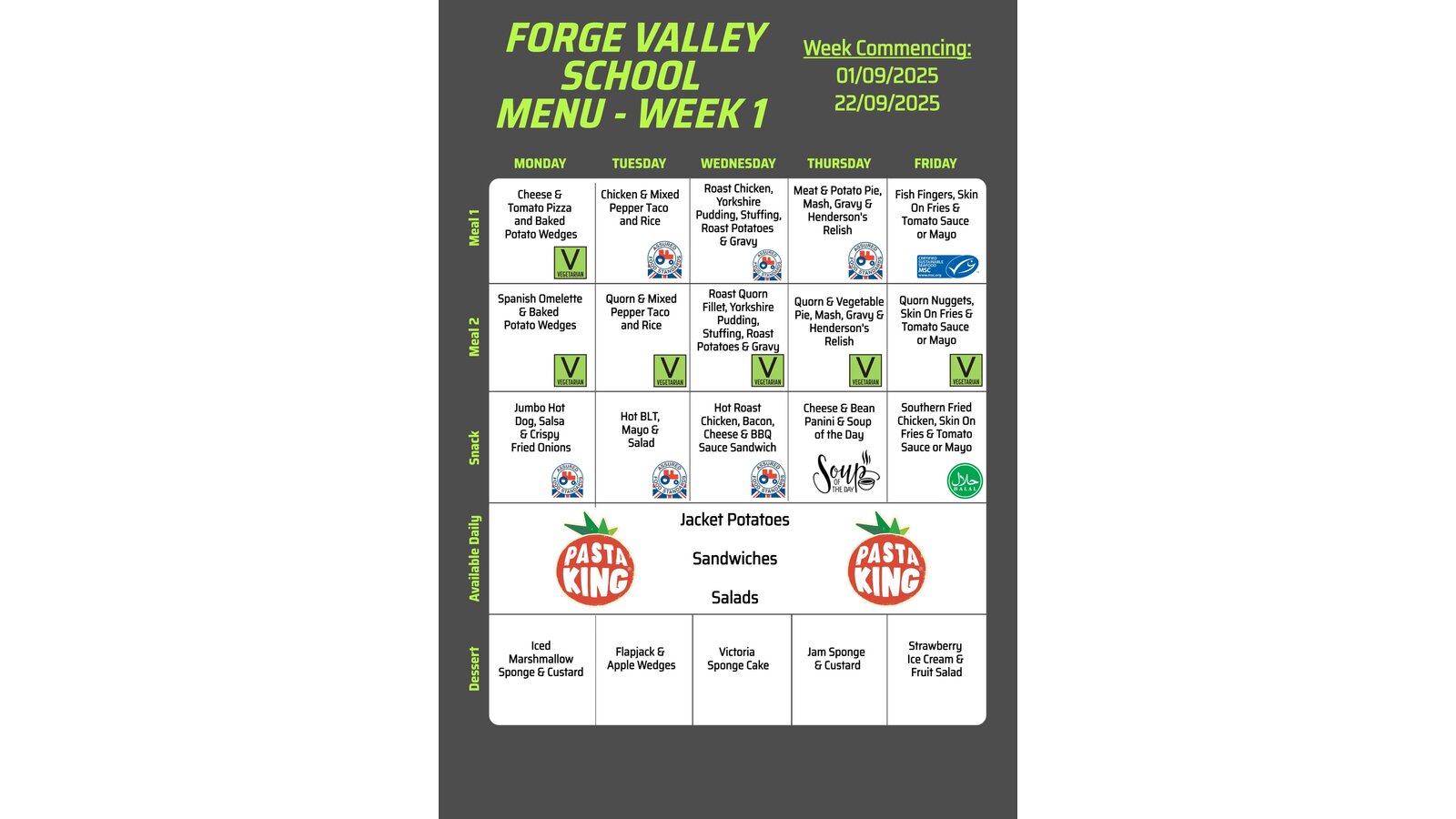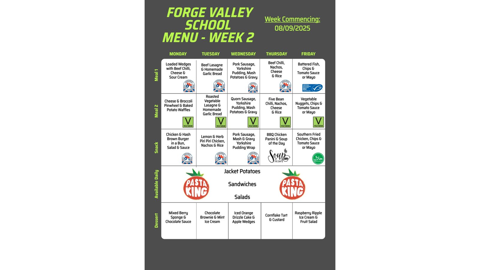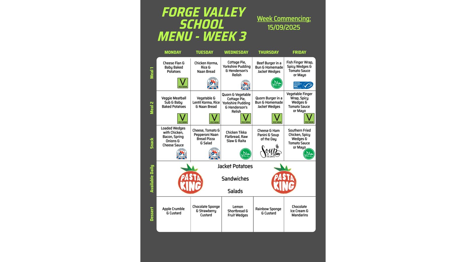 Our menu runs on a three‑week rotation, offering variety while ensuring balanced, nutritious choices. You can view the current menus below.