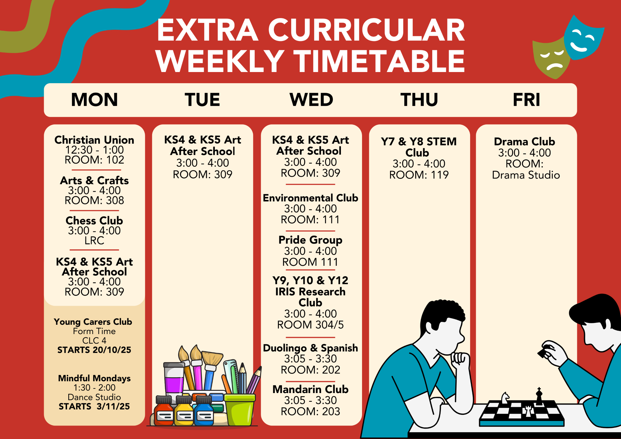 Please note that extracurricular activities may occasionally be cancelled at short notice due to unforeseen commitments. We recommend checking with teaching or support staff for the most up-to-date information.